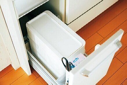 「キッチンにゴミ箱を置くと邪魔だし見た目が……」とゴミ箱はシンク横の引き出しに。シンクで水きりして生ゴミをポリ袋に入れ、引き出しを引いてポイ!床に水がポタポタ垂れません。
