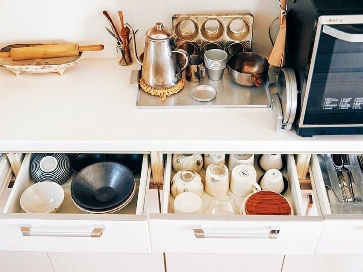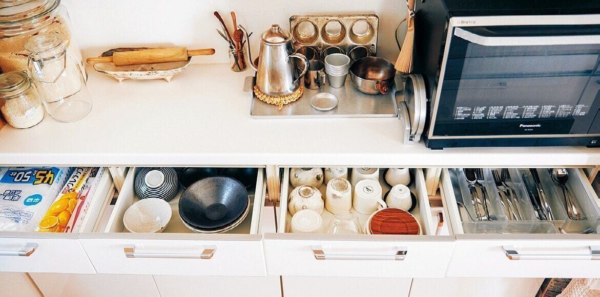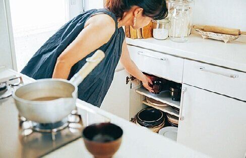 料理中「なんかモタつく」と感じたら棚と引き出しの中身を見直すサイン。使う物を最短ルートでパッと取って、サッとしまいます。