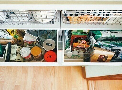 食器棚の下には、乾物やおやつ、キャットフードなどを収納。「半透明のケースでもラベルを貼っておけば、ひと目でわかり、出し入れが簡単に」。