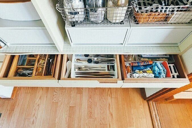 引き出しの右端は開閉しづらいため、あまり使わないべんとうグッズを。出入り口からすぐ手が届く中央に毎日使う箸類を集約しています。左には来客用のカトラリーを。