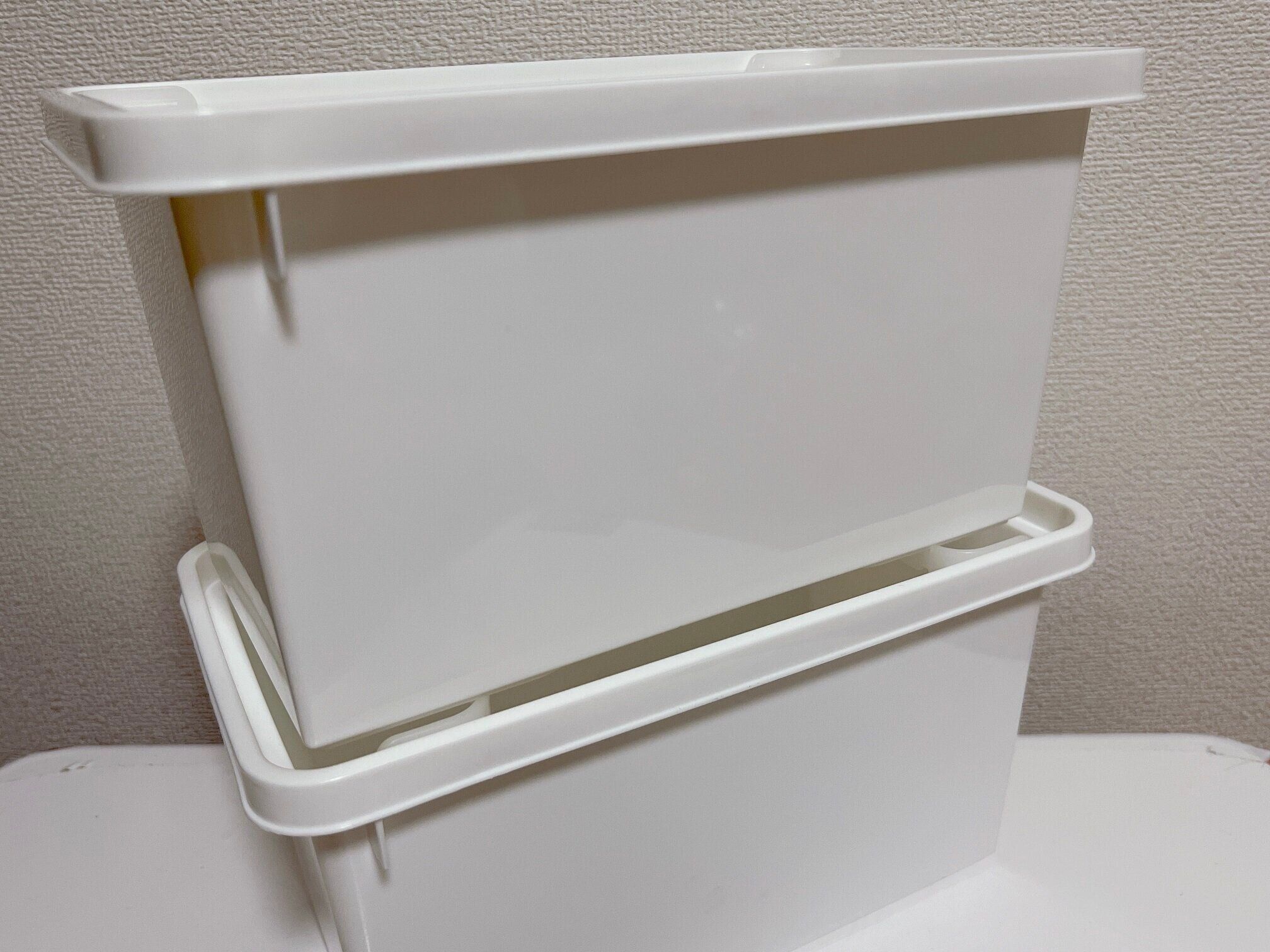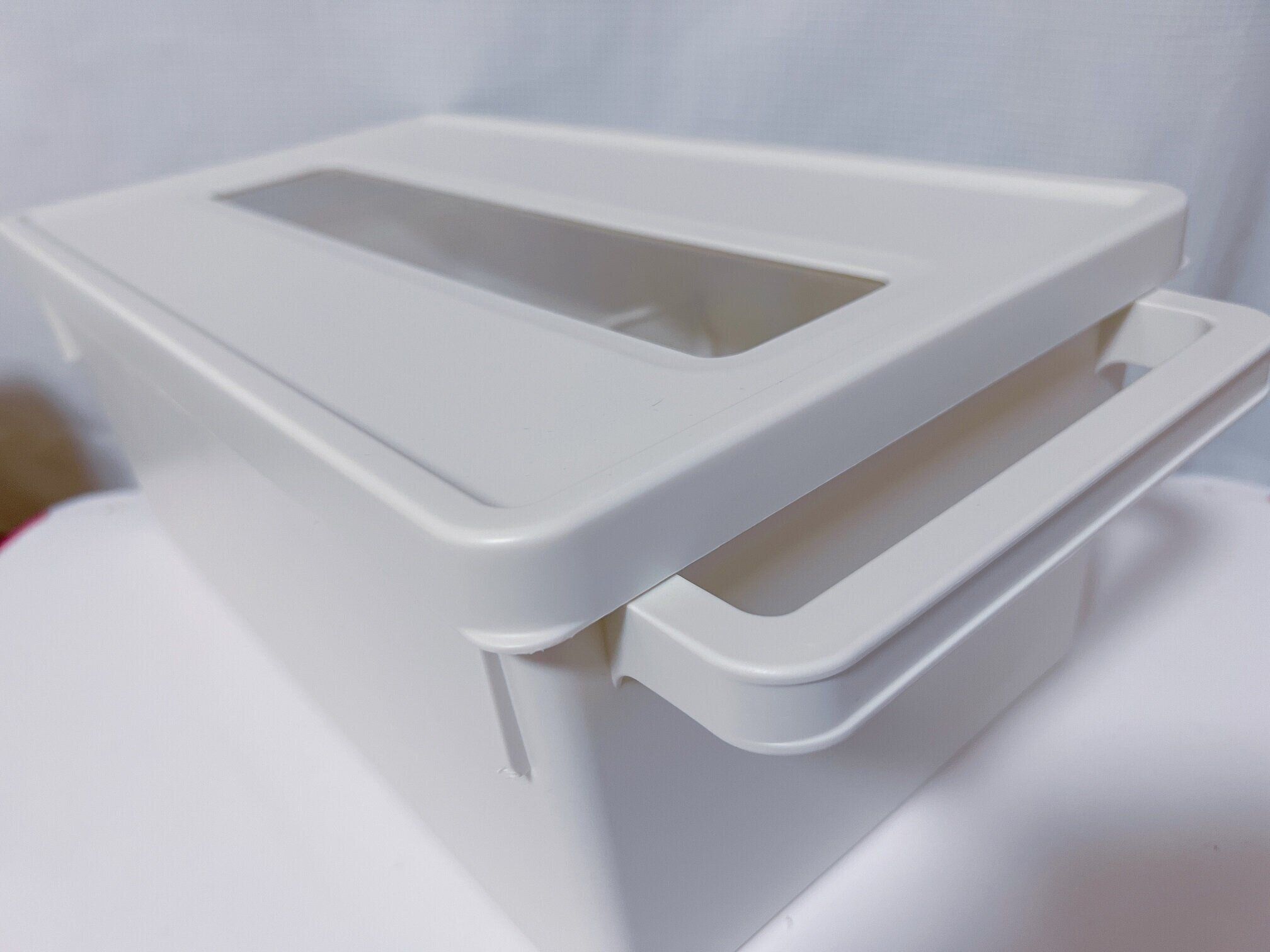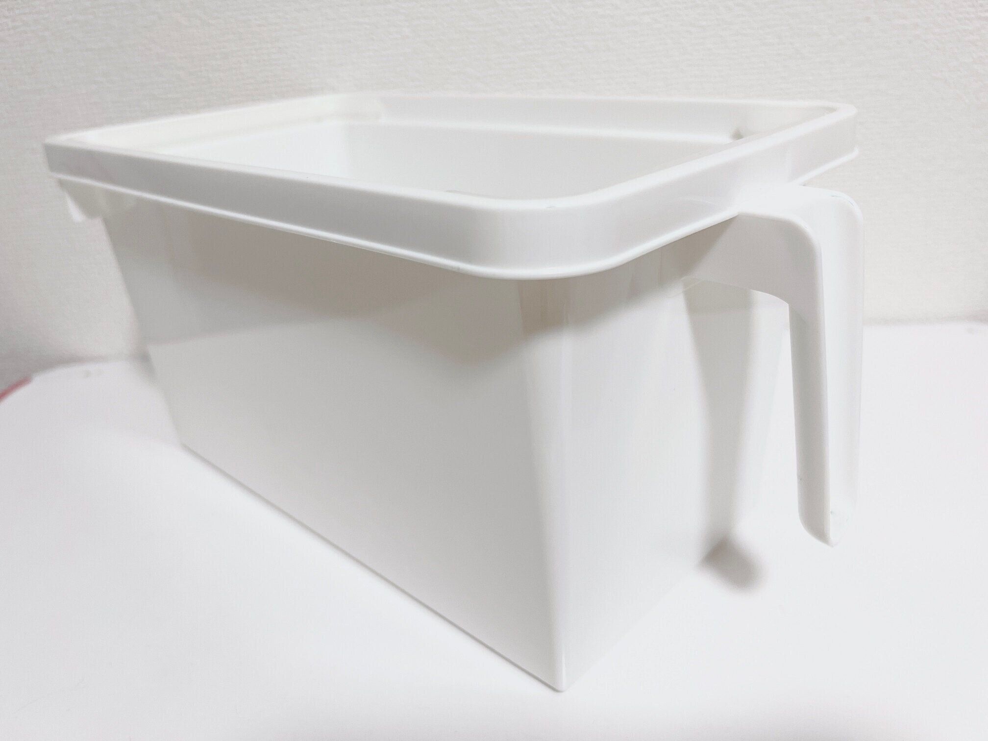 取っ手つきのボックスなので、少々重さがあるものでも取り出しやすいです。透明じゃないから中身がごちゃついていても見た目はスッキリ!サイズは約165×315×152mm。