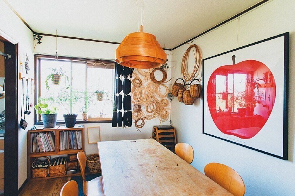 堀川さんの仕事場にもなるダイニング。籐のストックなど、道具類は飾りながら収納。ポスターは会社の退職時の記念にと購入した物。
