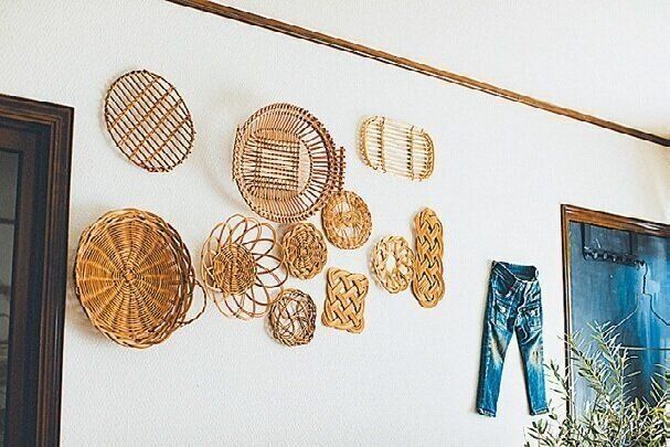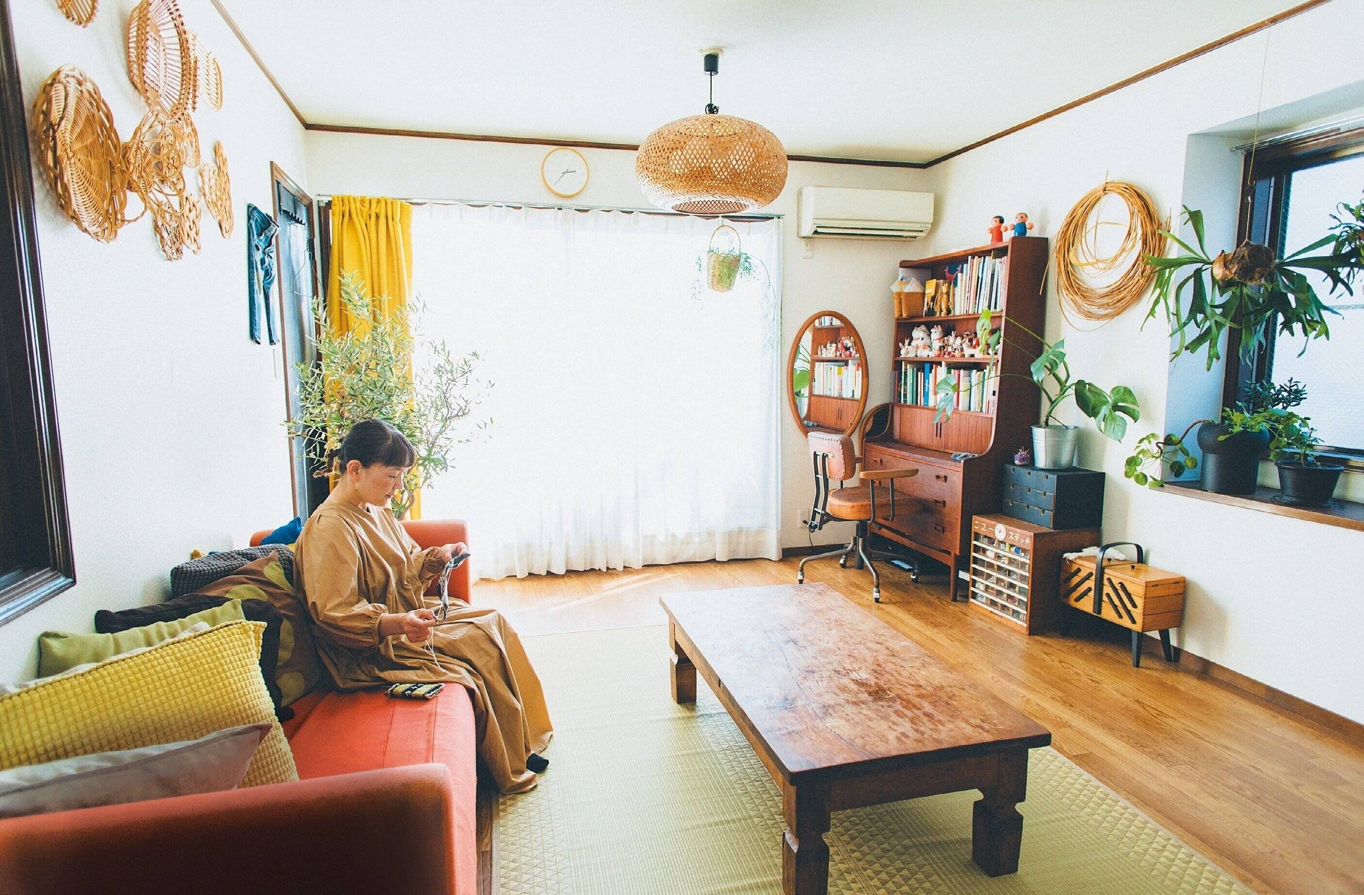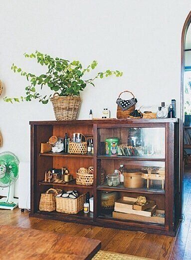 古道具が好きなので、家具はヤフオクなどで入手。色みがそろって統一感が生まれました。インテリアの差し色以外の物は、カゴに入れたり布を掛けたりしてスッキリと。