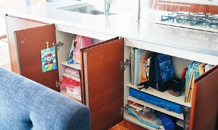 ダイニングに置いてもOKの子どもの物は「ここに入るだけ」というルール。ゴチャついてきたら「整理してね」と声をかけ、子ども自身に捨てる物を判断させます。
