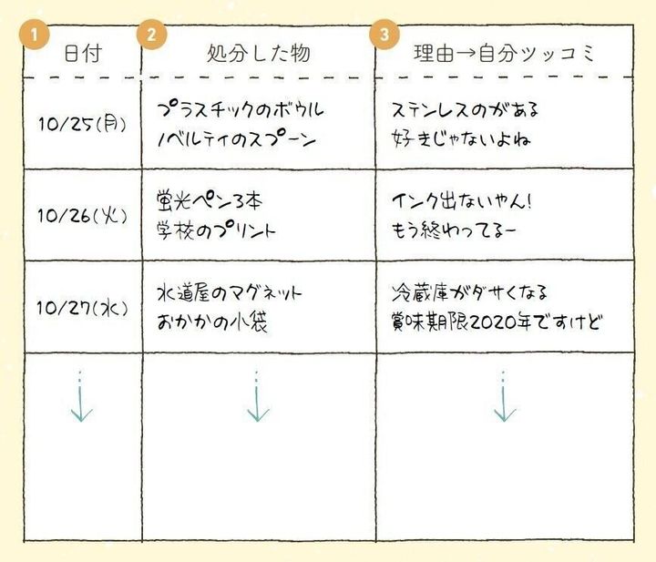 まずはノートやメモ帳に日付を書いて、その日処分した物を書き出します。量が多い場合は細かい品名は省略して「おもちゃゴミ袋1袋分」でOK。そして必ず書いてほしいのが「理由」です。その品がたちまち「The不用品」に見えてくるはず。ツッコミ風なら楽しく続けられます。