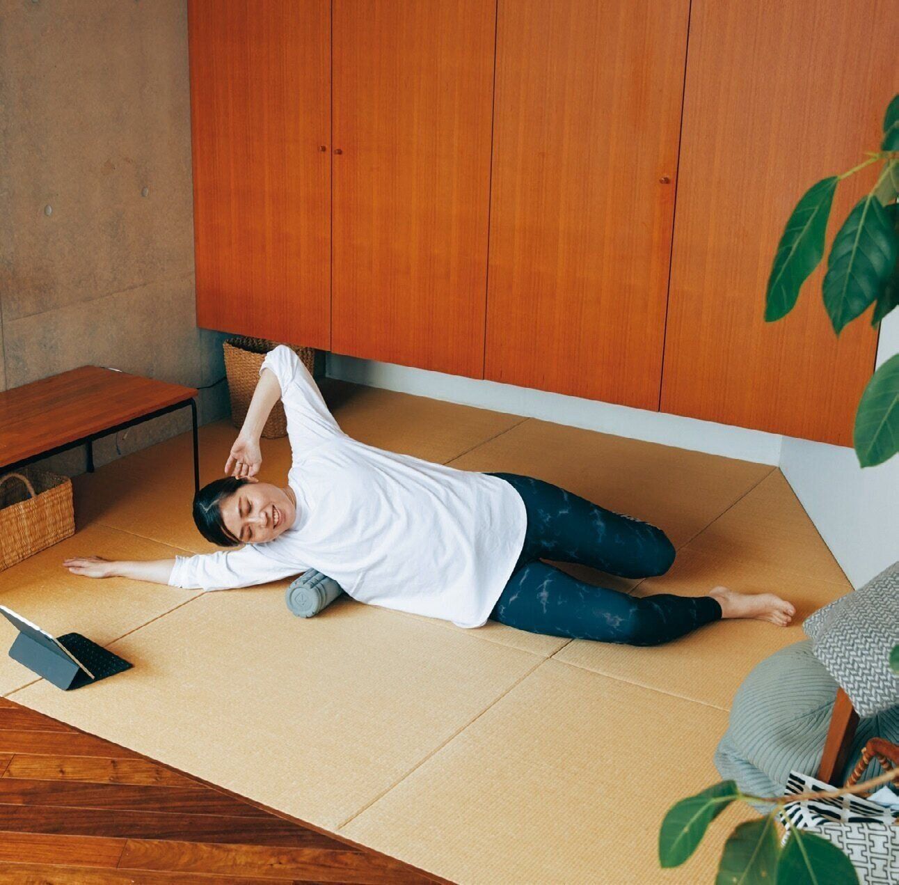 掃除や片づけなどの朝家事を終えたら、まずは15分の"筋肉ほぐし"トレーニング。「好きな動画を見ながらだとあっという間です。悩みの肩こりも解消しました」。