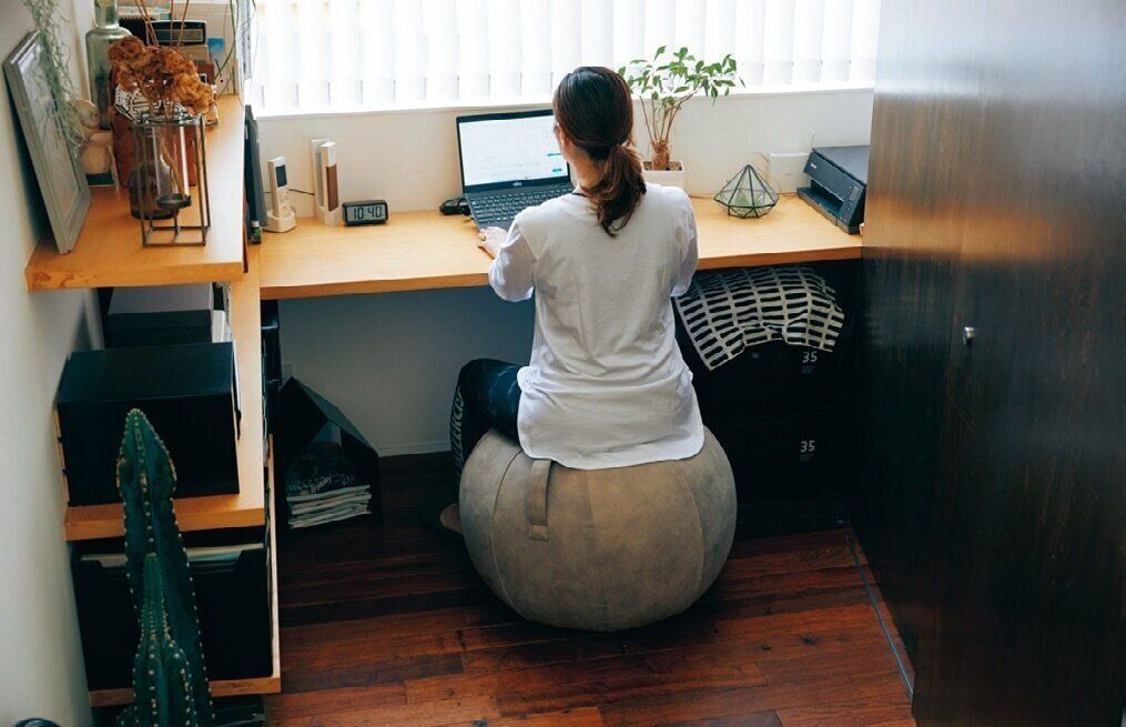 仕事中も体幹を鍛えたくて探した"わが家のインテリアになじむバランスボール"。「取っ手つきだから、仕事机で作業するときも片手で持ち運べます。移動させやすいから使う気になり、ほったらかしの防止に」。
