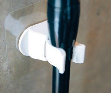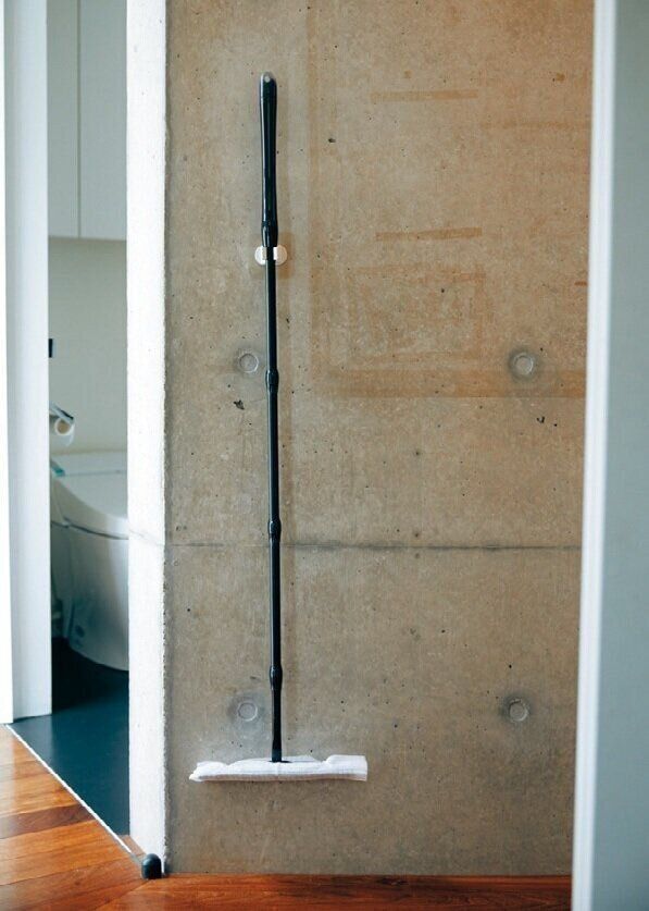 掃除用ワイパーは、ダイソーの壁掛けホルダーを使って毎朝必ず通る洗面所脇の壁に収納。隅に隠したりせず、あえて目に留まる高さに浮かせることで、「自然と手に取れ、寝ぼけぎみでも床掃除を始められる」そう。毎朝、乾燥機から取り出した洗濯物をしまうついでに廊下、階段、リビングまで一気に床掃除しちゃいます!