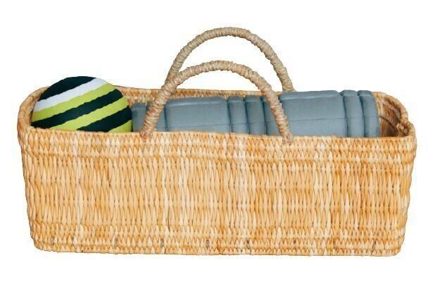色が派手なトレーニンググッズは、部屋のトーンになじむかごにまとめてデスク下に。「やろうと思ったらすぐ取り出せるから、トレーニングを始めるハードルがぐっと下がります」。