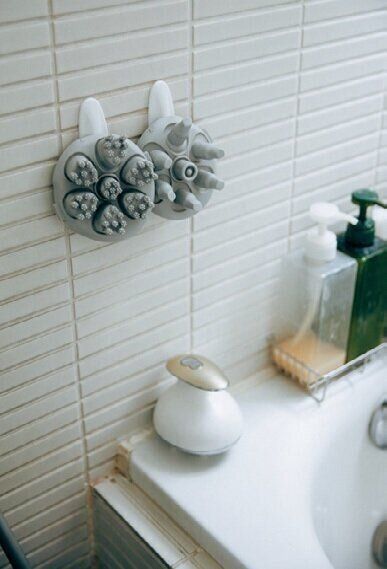 40代になり抜け毛が増えてきたという宇高さん。「顔のたるみも防げるので、浴槽内では頭皮ケアをしています。本体を浴槽脇に置き、アタッチメントは浴室OKのフックで壁につるし、手に取りやすく」。