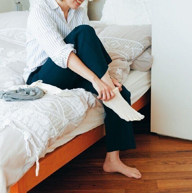 「冷えとり靴下」をはき始めたら、不調が改善して風邪もひかなくなったそう。「でも面倒くさがりだから日中はムリ。就寝時だけ絹と綿×各2の4枚重ねばきをしてゆるく温活しています」。