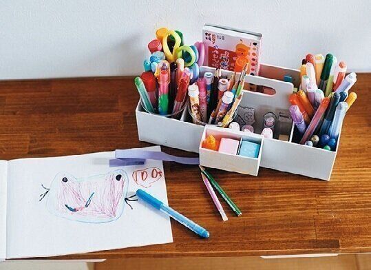 お絵描きするときは、ダイニングテーブルなどに移動することも。「まちまちなペン類を持ち手つきケースにまとめたら、一度に持ち運べて片づけもラクに」。