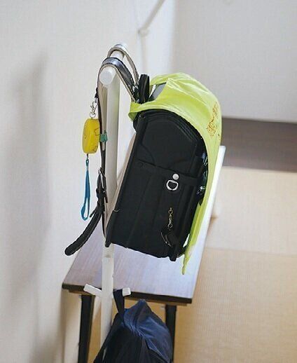 ランドセルや園バッグの指定席は和室の出入り口に。「ラックにちょい掛けするだけなら子どもにも簡単にできるので、床に置きっ放しにすることがなくなりました」。