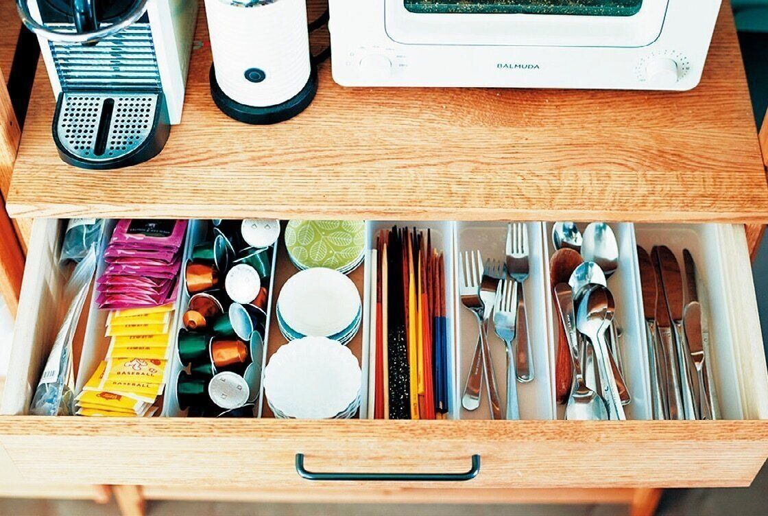 箸やカトラリーは、家族が使う分だけ厳選。トレーの中は1本ずつキレイに並べるより、出し入れしやすければOKとしています。よく使うティーセットも同じ引き出しに。