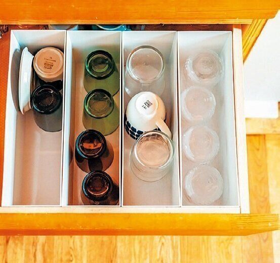 ●引き出しに書類ケースを入れ、コップ類の収納に。割れにくく、出し入れもラク