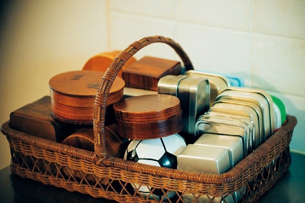 べんとう箱はしょっちゅう使うのでしまい込まず、カウンター上に出しっ放し。紙カップやしょうゆ入れの予備はカウンター下の棚に。カゴにまとめているので出し入れもラク。