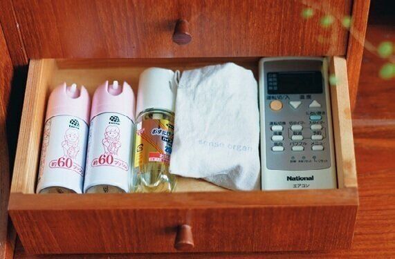 出しっ放しは目ざわりだけれど、しまい込むと不便なエアコンのリモコンは、小さな引き出しに収納。エアコンの正面&立ったまま出し入れできるベスポジです。