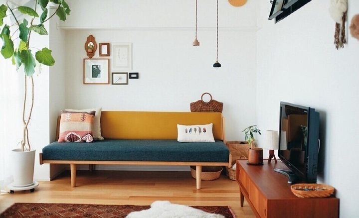 ダイニング側にワークスペースがあるため、どうしても物が多くなりがち。その分、リビング側は壁の白さが引き立つように背の低い家具だけを配置。メリハリをつけています。