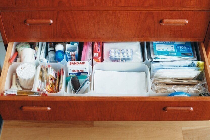 家族が使うケアアイテムを最下段に集結。何がどこにあるのか、上から見てすぐわかるから、「どこ~?」って聞かれず補充もラク。