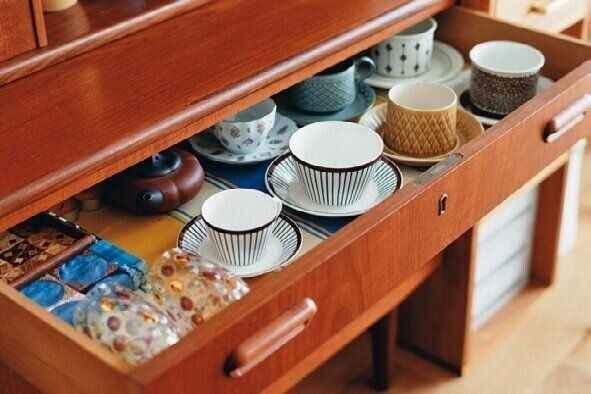 趣味で集めたカップ&ソーサーは、しまい込むと宝の持ち腐れになるから、いちばん出し入れしやすい段に収納。「ここに入る量だけ」を守って一目瞭然に。