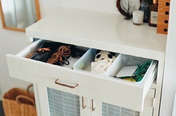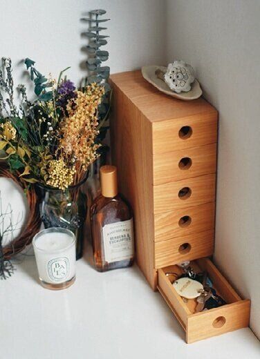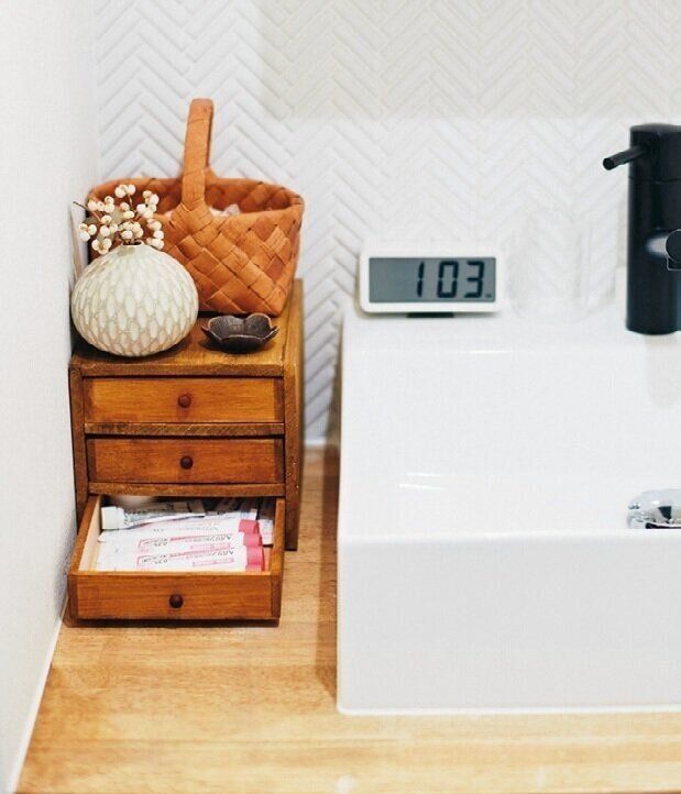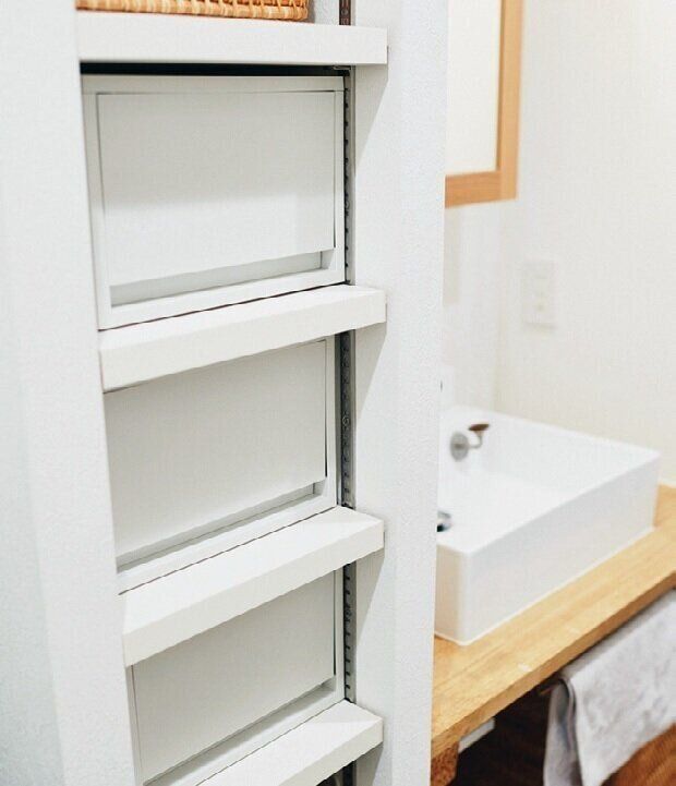 お風呂上がりに塗る習慣に合わせて、塗り薬専用の引き出しを置きました。インテリアになじむのも、引き出し収納のいいところ。