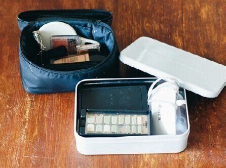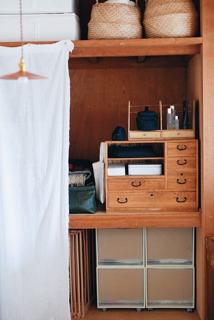 自室の押し入れ上段は使いやすい高さだから身支度アイテムの収納に最適。メイク道具はポーチに、ネイルの道具は缶にひとまとめ。