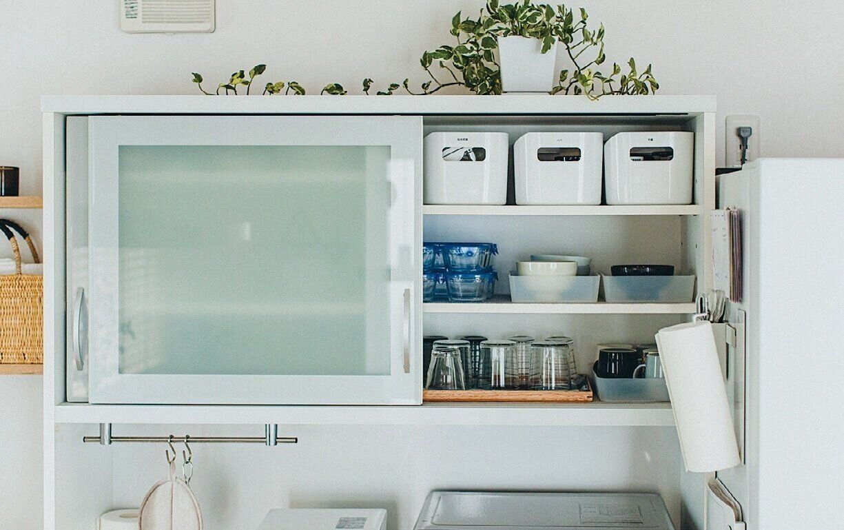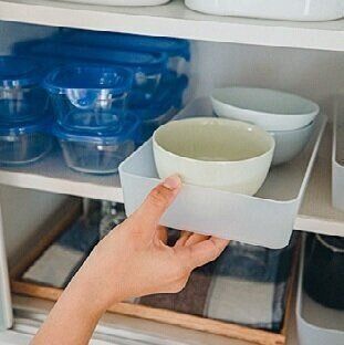 食器棚にBOXやトレーを入れて「お椀」「お茶碗」とカテゴリーごとに分類。こうするとアイテムが混在せず、目的の物がすぐ取れます。