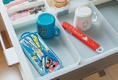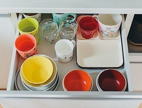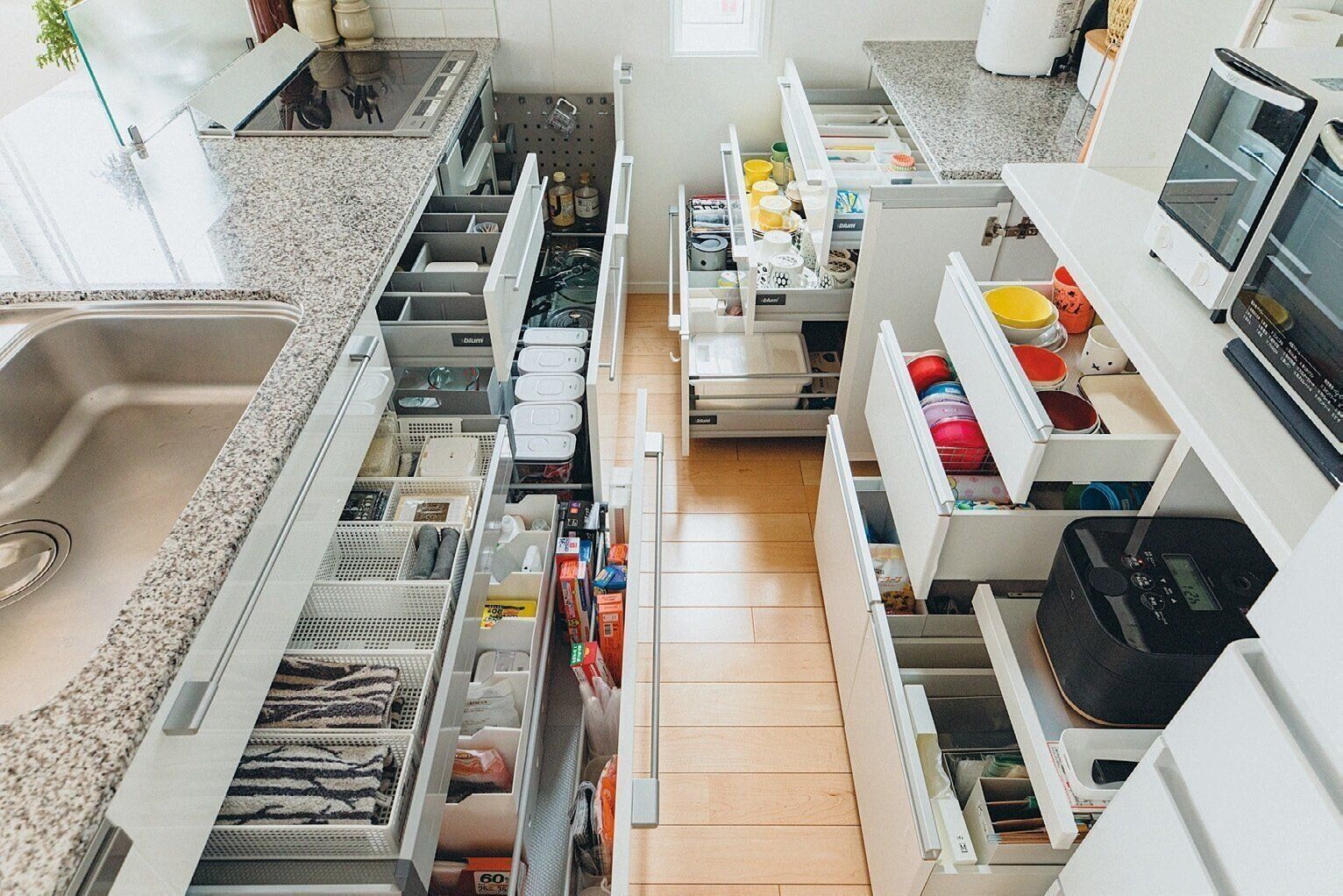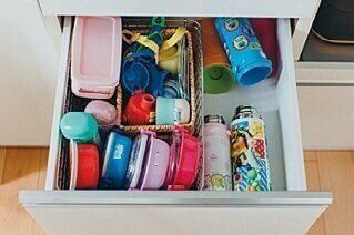 食器棚の引き出しは「子どものごはん用」、「おべんとう作り用」など、使うシーンごとにまとめて収納。こうすると必要な物が一気にそろって圧倒的時短に。