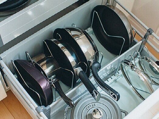 サイズ違いの鍋は定位置を決めないと出し入れしづらいから、それぞれ鍋の部屋を作るべく幅を調節。"持ち手は手前"が取りやすい!