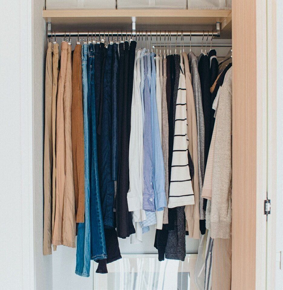 上下をずらっとつるすと、全身コーデが30秒で決められる。服はトップスとボトムス各19枚。「上下どの組み合わせでも合う色にしぼっているので、その日の気分でぱっと選べます」。
