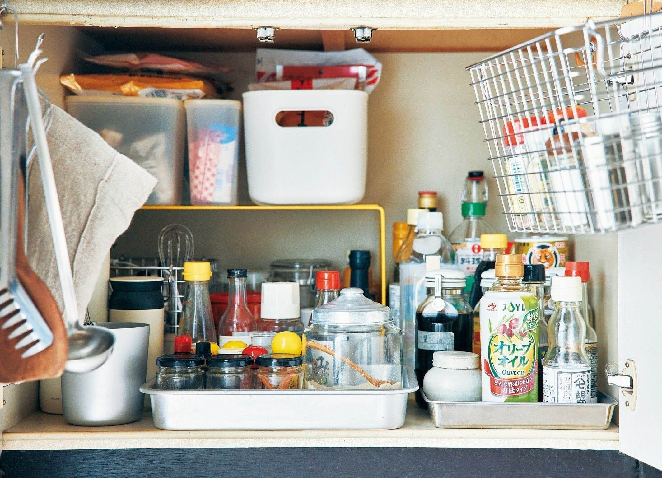 ガス台の下の収納では、背の高い物は後ろに、背が低い物や使用頻度の高い物は手前に置きき、全体が見渡せるように並べます。