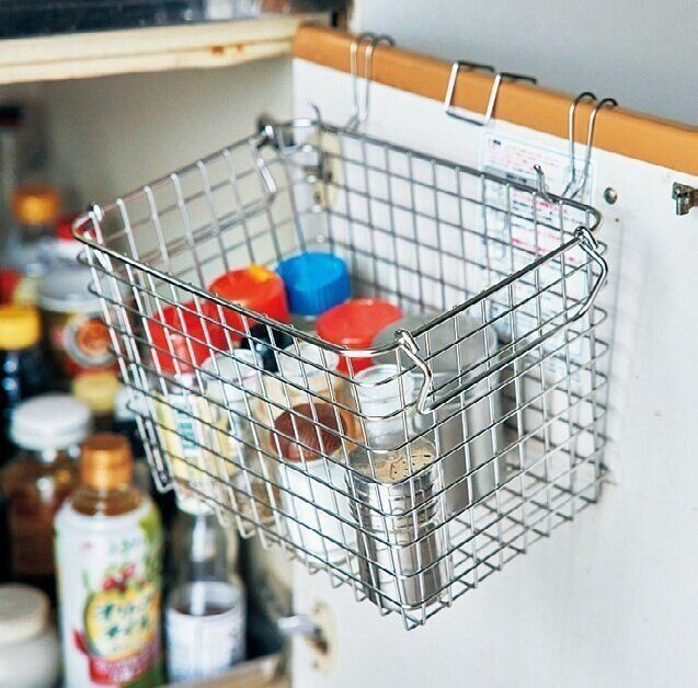 扉に掛けられるフックにワイヤーバスケットを引っかけて、ガス台の下の収納スペースを拡大。かがまずに手に取れるから、よく使う調味料の定位置にしています。フックもバスケットも無印良品。「収納グッズは同じシリーズでそろえておくと、家中で使い回せていいですよ」。