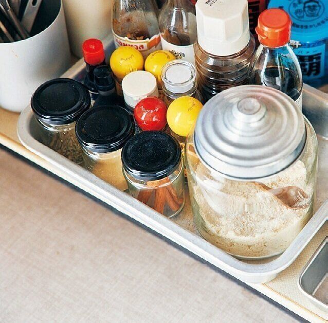 小びん入りのスパイスや液体調味料は、バットにまとめておくと移動がしやすく掃除もラク。気に入った空きびんは捨てずに取っておき、袋入りの香辛料を詰め替えて再利用。びんなら中身が見えるので、うっかり使い忘れることもなくなりました。
