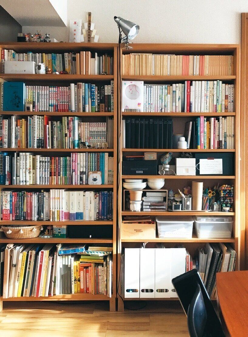 「背の高い本は下に置き、背表紙の色をそろえるようにして、圧迫感を減らしています」。いくつかすき間をつくって小物を飾ることで、本棚全体がギャラリーのような空間に!