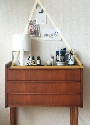 ●家具の上の壁にポストカードを貼るだけで、簡単に三角形が作れる