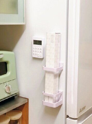 ホルダーが2つに分かれていて、しまう物の長さに合わせられるのが便利。マグネットが貼れる場所ならどこでも使えるので、冷蔵庫や洗濯機まわりに活用すれば家事がスムーズに。