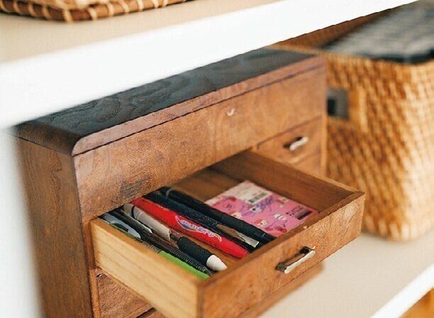 こまごました文房具は古い裁縫箱にひとまとめ。中段より上なら子どもの手が届きにくいし、夫に「あれはどこ?」といちいち聞かれることもありません。