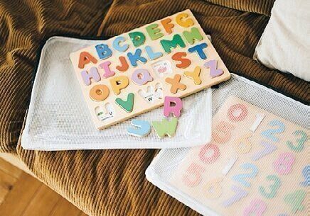 迷子になりがちなパズルは、100均のファスナーつきケースに1種類ずつ収納。「中身がひと目でわかるから、子どもでも出し入れがしやすいんです」。