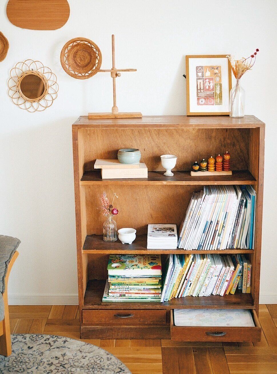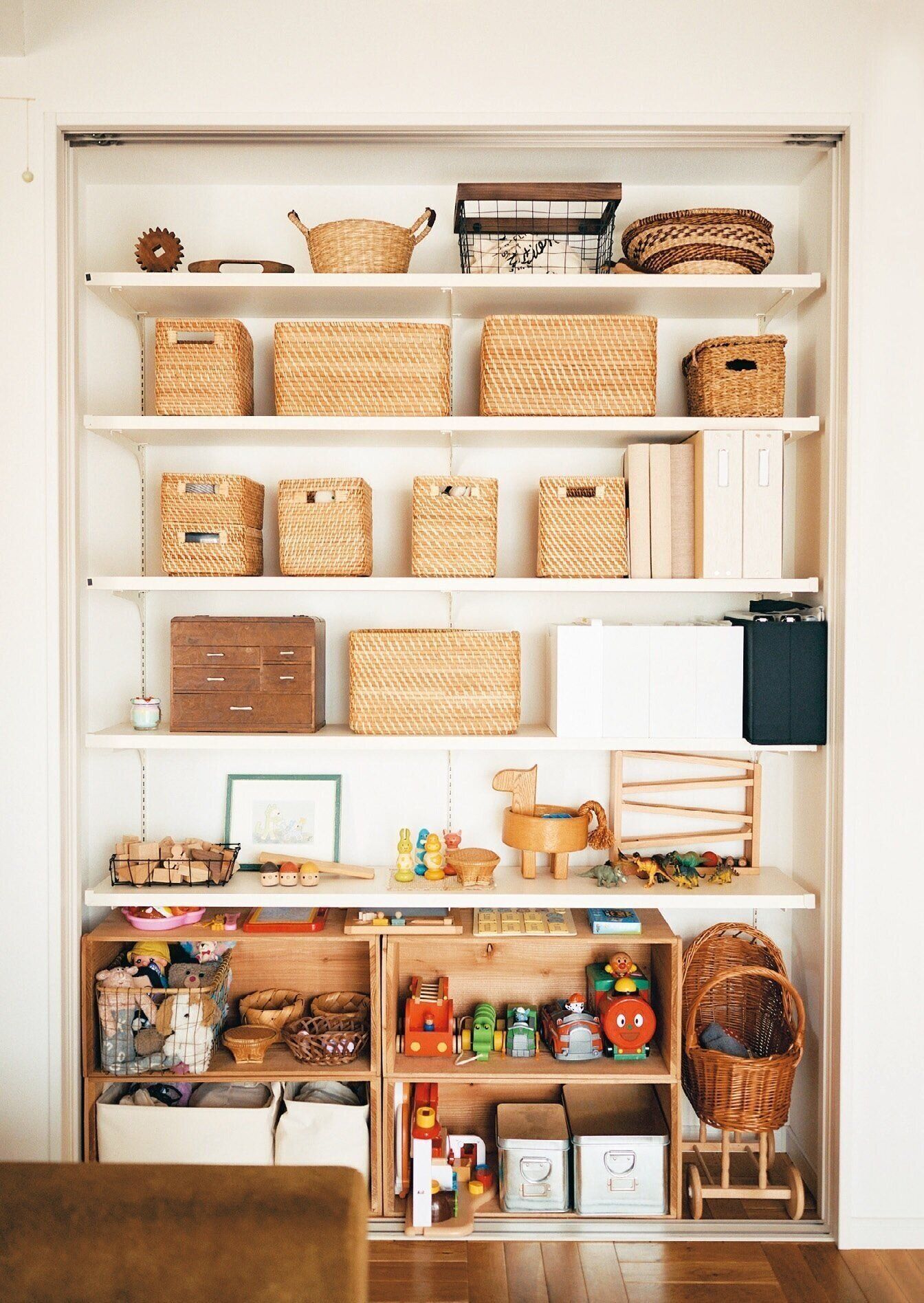 中段より上は大人用、下段は子どものおもちゃ。カゴや木箱を使えばインテリアになじみます。カゴは少し隙間を空けて並べると、スッキリした印象に。