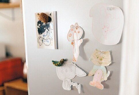子どもの作品は切り抜いて透明マグネットで飾るといっぱいあってもかわいい