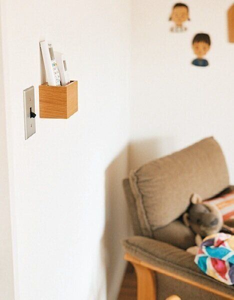 ドアの近くに収納ポケットを取りつけ、エアコンのリモコンと体温計の指定席に。「しゃがまずにすぐ手に取れ、出がけに探し回ることもなくなりました」。