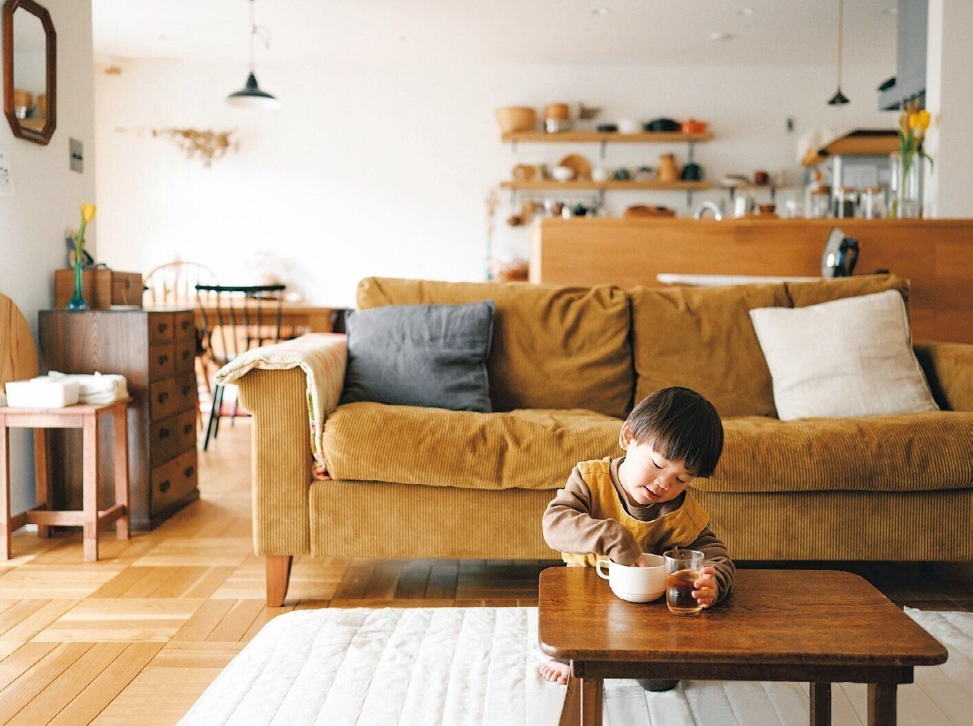 夫(32歳)、長女(4歳)、長男(3歳)の4人家族。古道具と自然素材を生かした、ぬくもりあふれるインテリアがSNSで人気を集める。インスタは@____.megumi_
