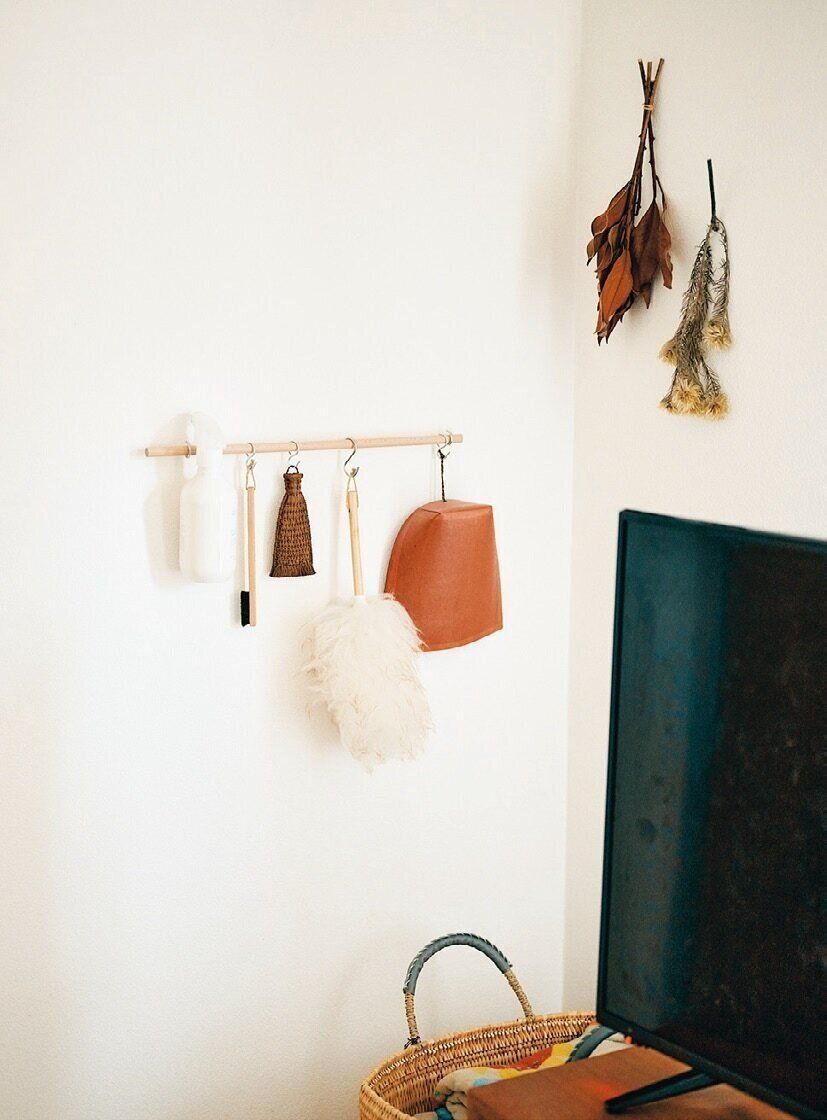 毎日使う掃除グッズは、S字フックでつるしてリビングの隅にスタンバイ。出しっ放しでも絵になるおしゃれなグッズをチョイスすれば、苦手な掃除も苦になりません。