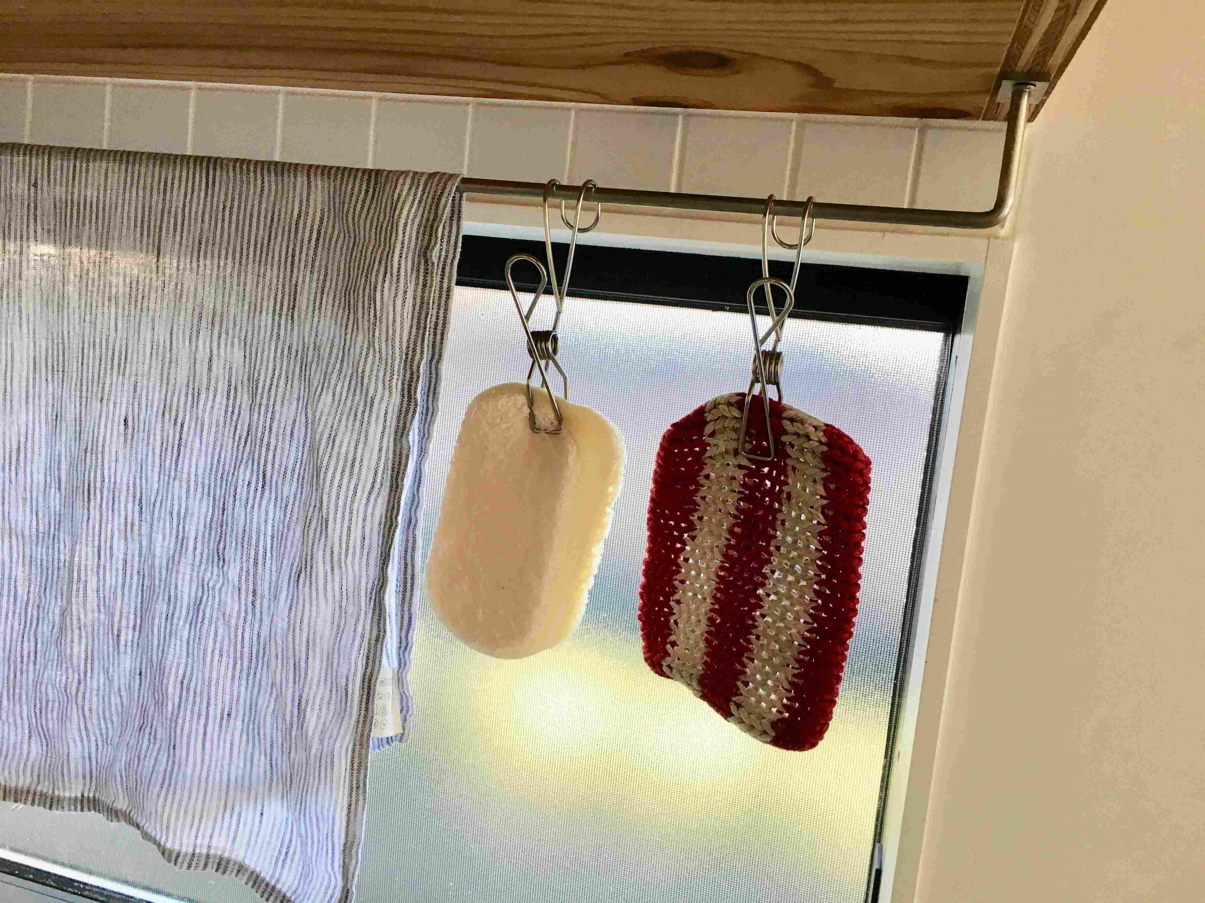 キッチンで使うスポンジ類も吊り下げ収納がおすすめ。サッと取れることはもちろん、乾かしやすく、清潔に保てます。