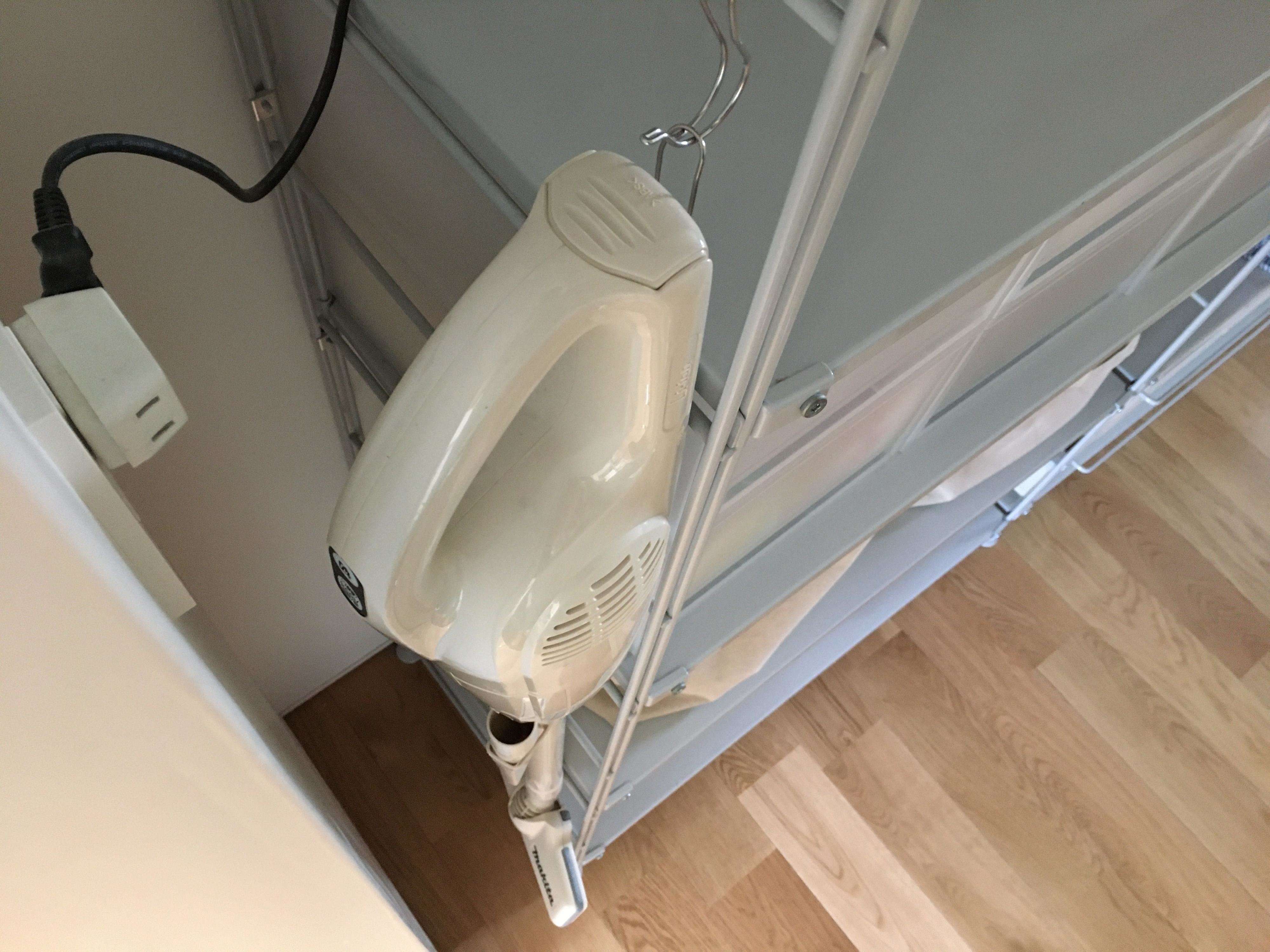 ハンディクリーナーの収納は出し入れのしやすさが命! サッと掃除したいときに使えるよう、ウォークインクローゼットのすぐ手前に吊り下げて収納しています。