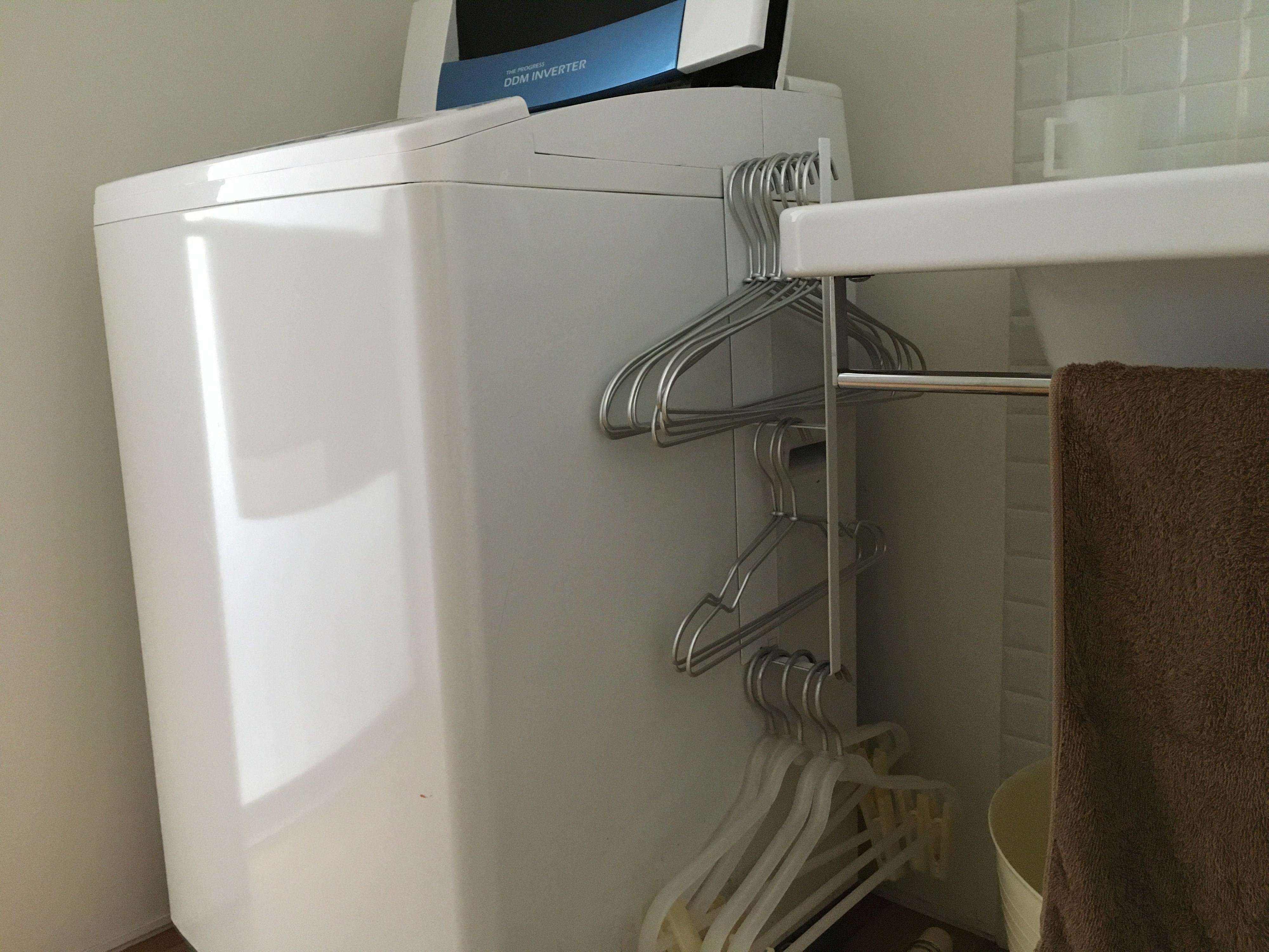 厳密に吊り下げ収納と呼べるのかは疑問なのですが(笑)、ハンガー類も画像のように洗濯機の横にひっかけて収納しています。