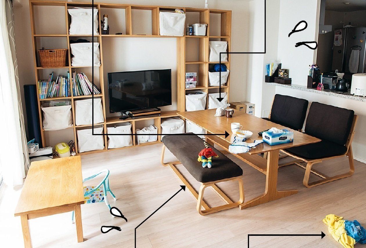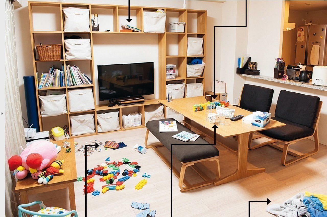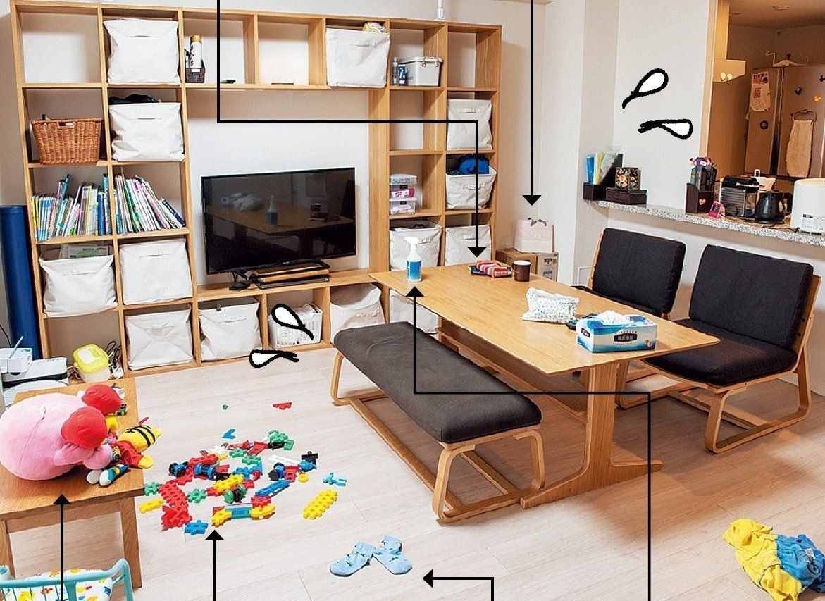 朝は出勤準備で忙しくて片づけどころじゃないし、夕方帰宅したら夕食を作って、子どもに食べさせて、お風呂に入れて、寝かせて……と常に手いっぱいなんです。子どもを寝かすまでにやることがいろいろあるから、どーしても片づけは後回しになって、気がつけばこの状態(汗)。