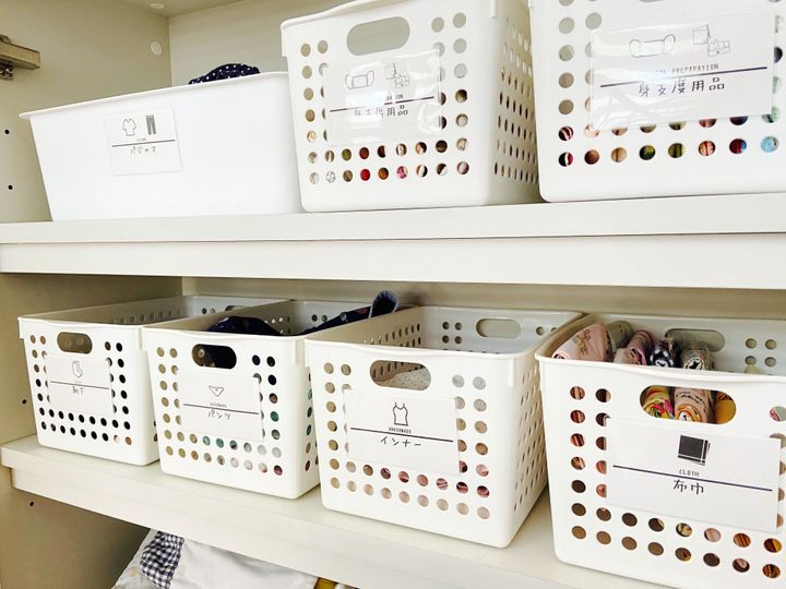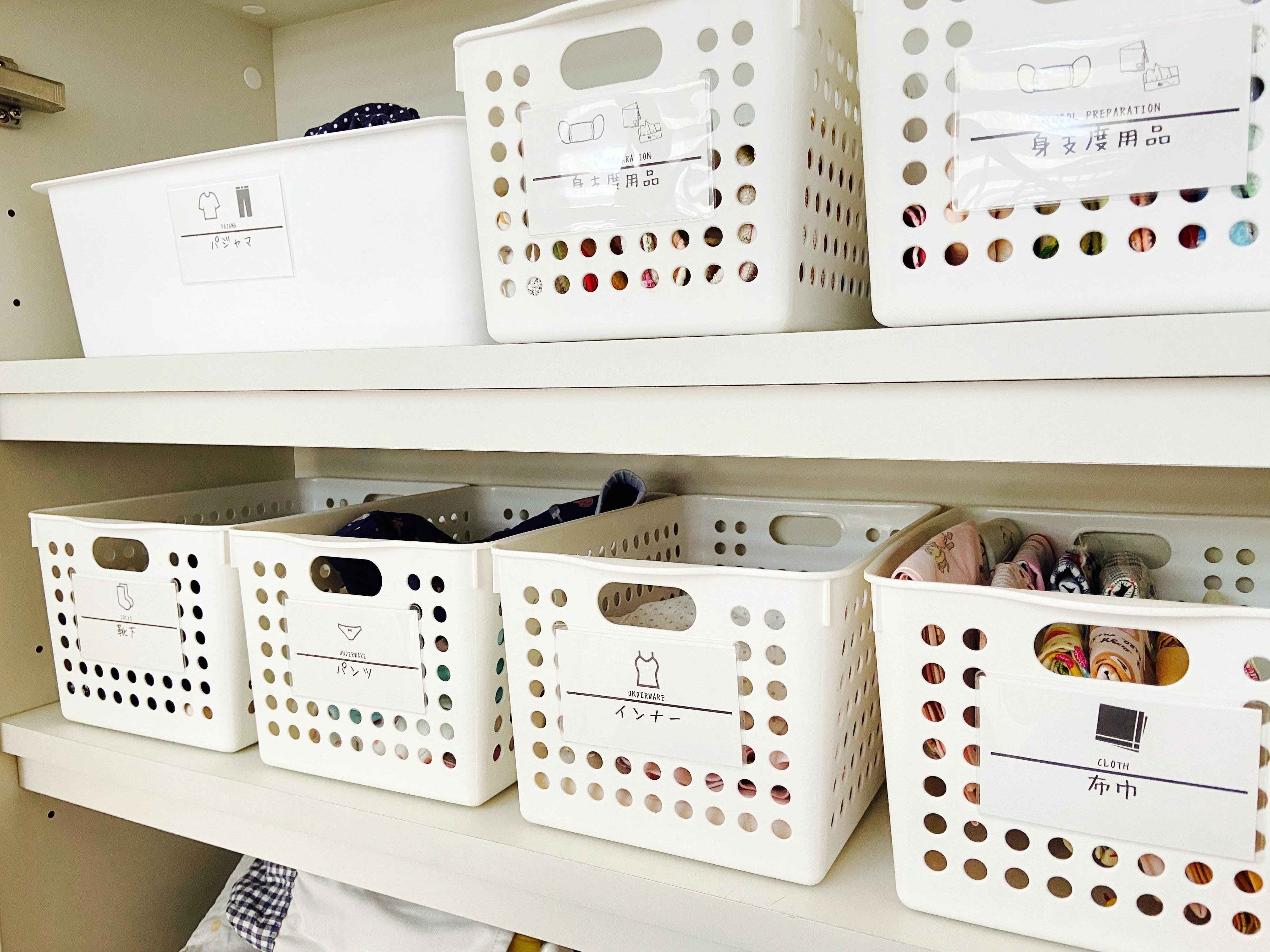 子どもの収納にはボックス収納がおススメです。理由は、ラベリングがしやすく、中身を分類しやすいから。また子どもにお片づけをしてもらうときに、きれいに入れてもらおうではなく、ここに入っていればよし!という放り込み方式が採用できます。放り込み方式でも、見栄えが悪くないというメリットもあります。