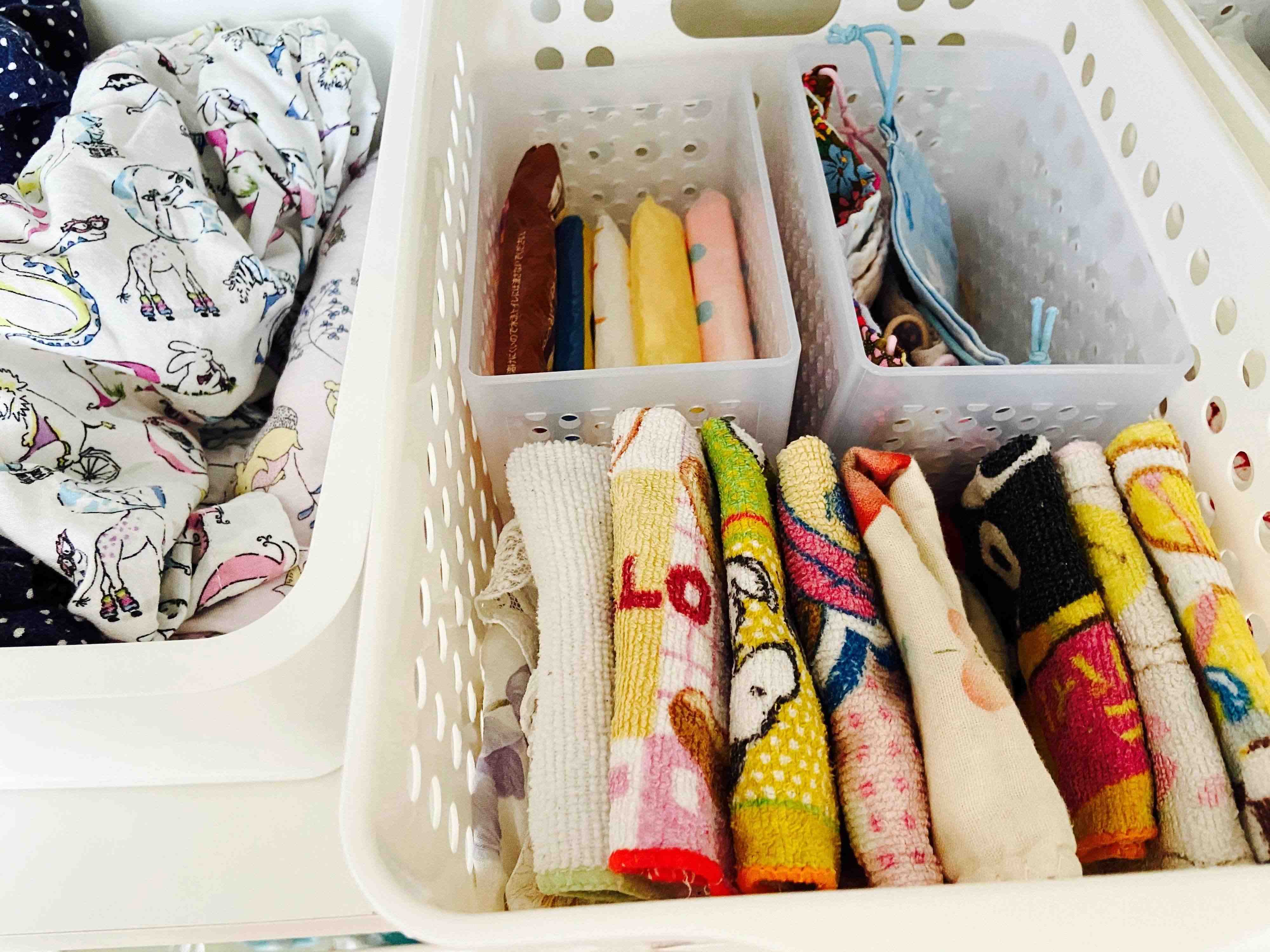 たくさんあると選択するという行為のハードルが上がってしまいますよね!子どもたちが大きくなるにつれ、その子に合わせて選択の幅を広げてあげるのはよいことですが、子どもが小さいうちは、極力量を絞ってあげるほうが子どもにとっては選びやすくてよいと思います。洋服ならMAX平日の5日分、パジャマなら3日分、下着も3日分、それくらいの量に絞っておいてあげると管理もしやすいので、片づけも自分でできるようになります。