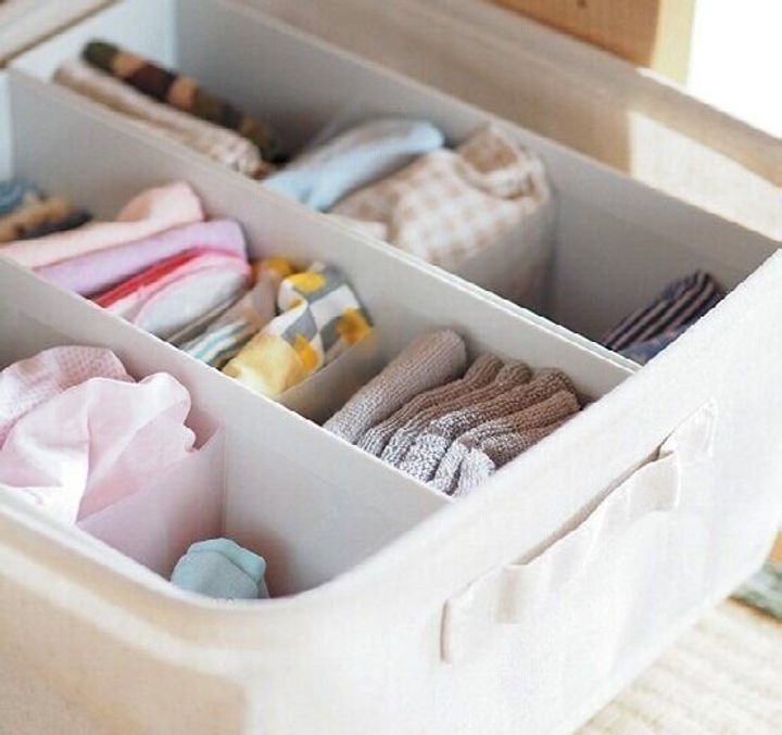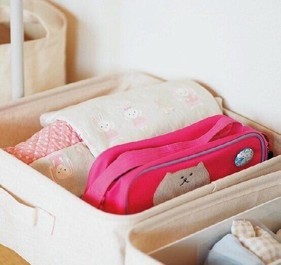 ハンカチや下着などの小物類は、ソフトボックスにプラスチックボックスを入れて立てて収納。中の量が変わってもソフトボックスがヘタらず、ゴチャつきません。